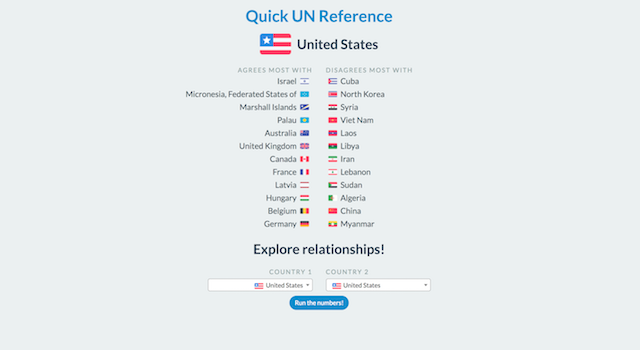Conceived and developed a United Nations members' relationship matrix. UNLabs provides interactive tools that quickly estimate how the relationship between two United Nations member states can be quantified, based on previous United Nations General Assembly voting records. This web app (based on Rails) was developed to serve this information on the web for public use.